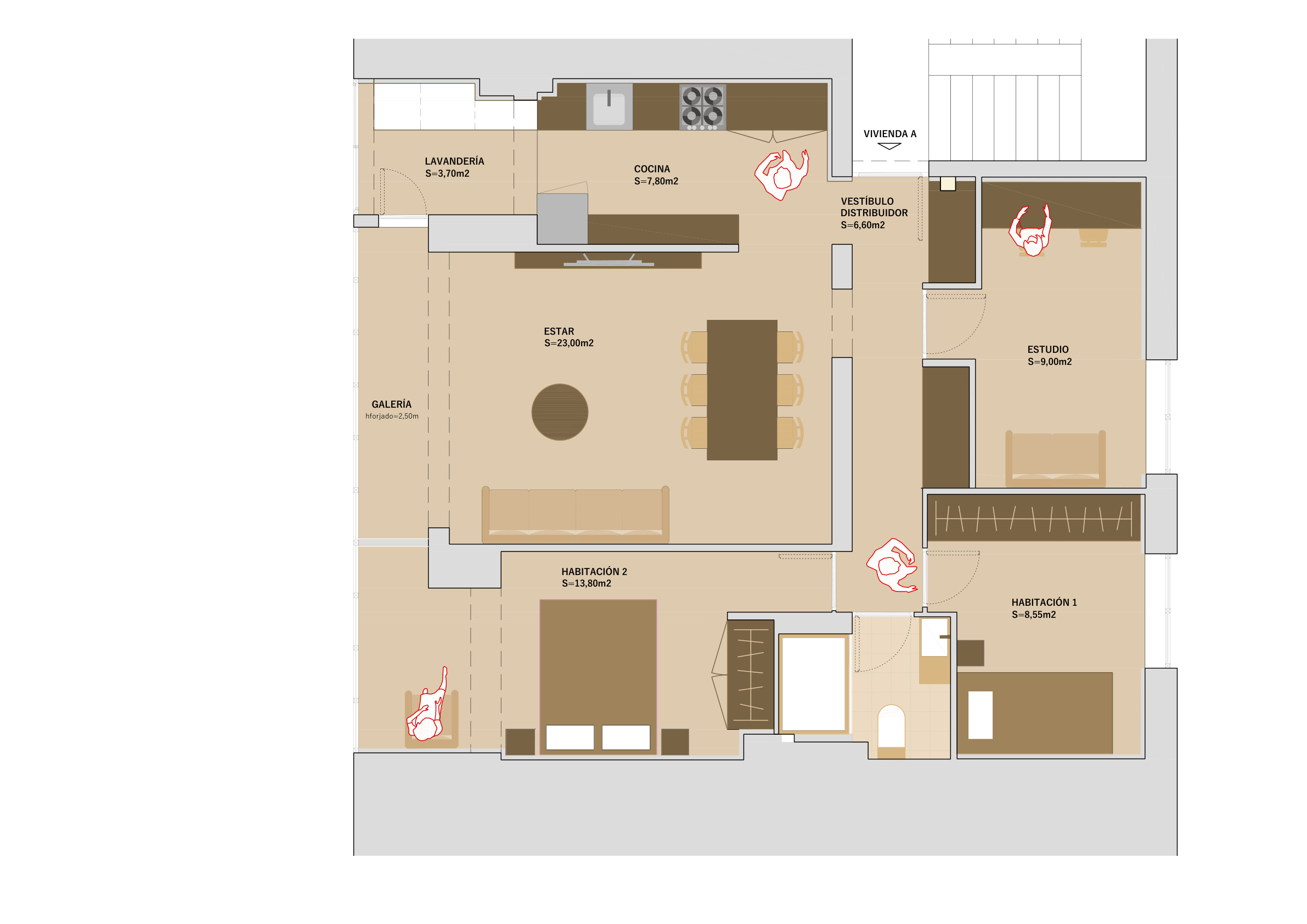 Proyecto de reforma integral de una vivienda concebido para mejorar la distribución interior y potenciar la amplitud, la funcionalidad y la entrada de luz natural. La propuesta organiza la vivienda en torno a una generosa zona de estar, conectada con la cocina y complementada con lavandería, dos habitaciones, estudio, galería y un distribuidor que ordena de forma clara y eficiente todas las estancias.