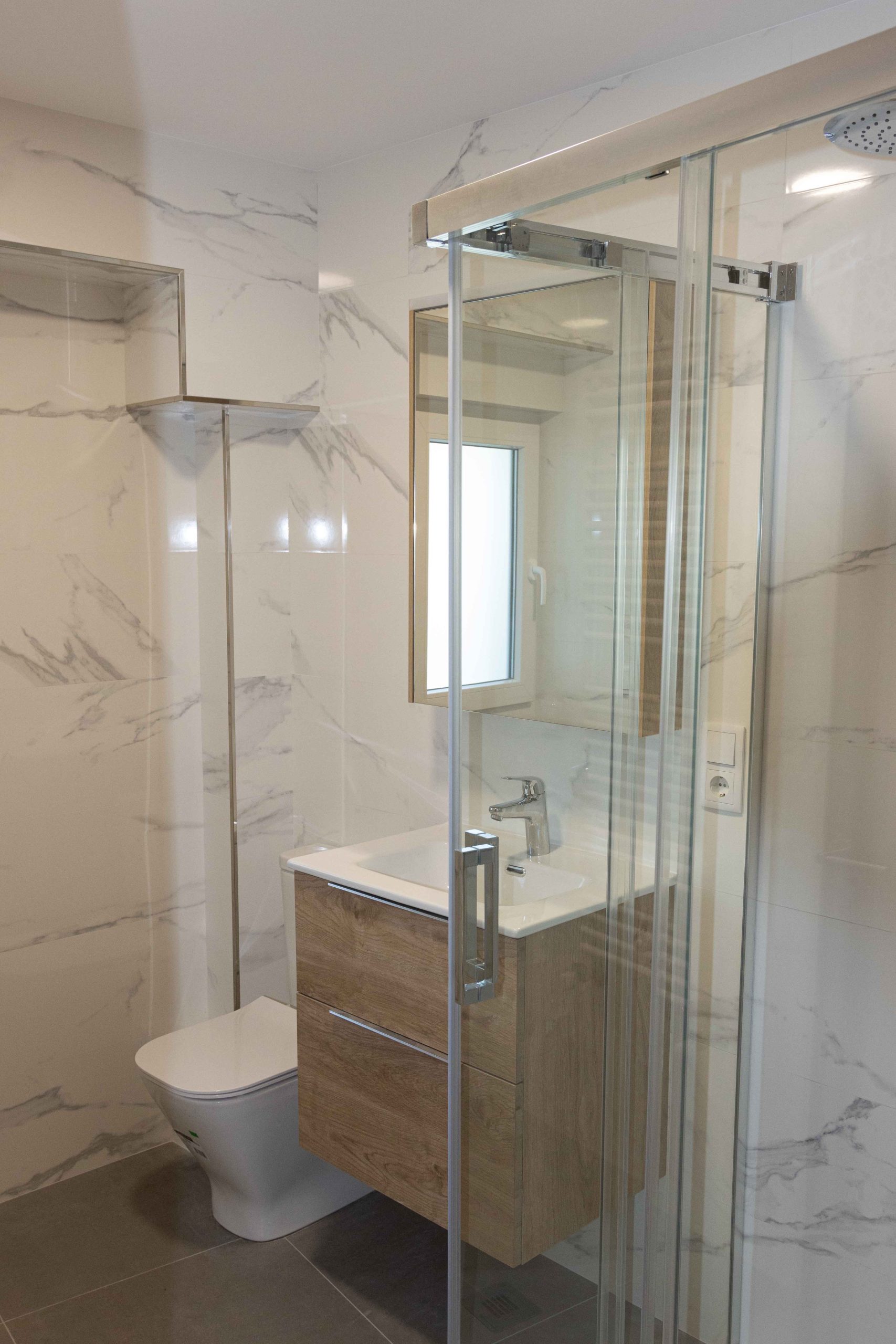Baño completamente renovado: revestimento porcelánico efecto mármore, mampara de ducha, moble de lavabo suspendido con almacenaxe e sanitarios de liñas actuais.