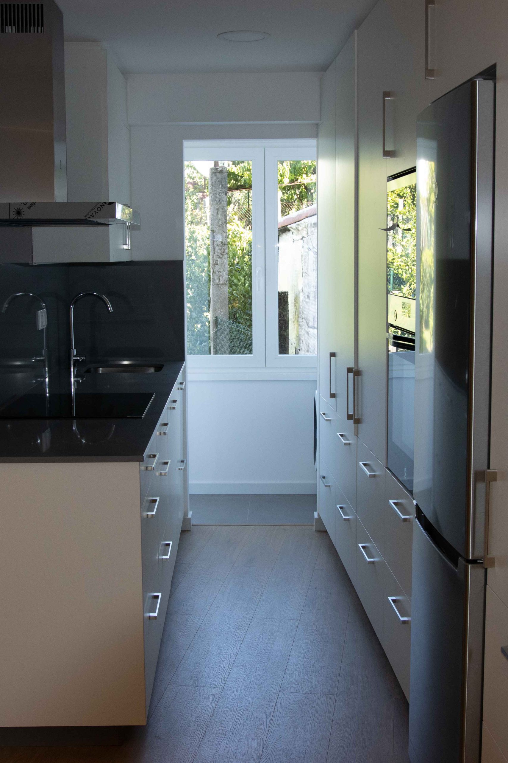 Cociña nova a medida: mobiliario en acabado branco con gran capacidade de almacenaxe, encimera e frontal en negro, campá decorativa en inox e equipamento integrado (forno en columna e frigorífico).