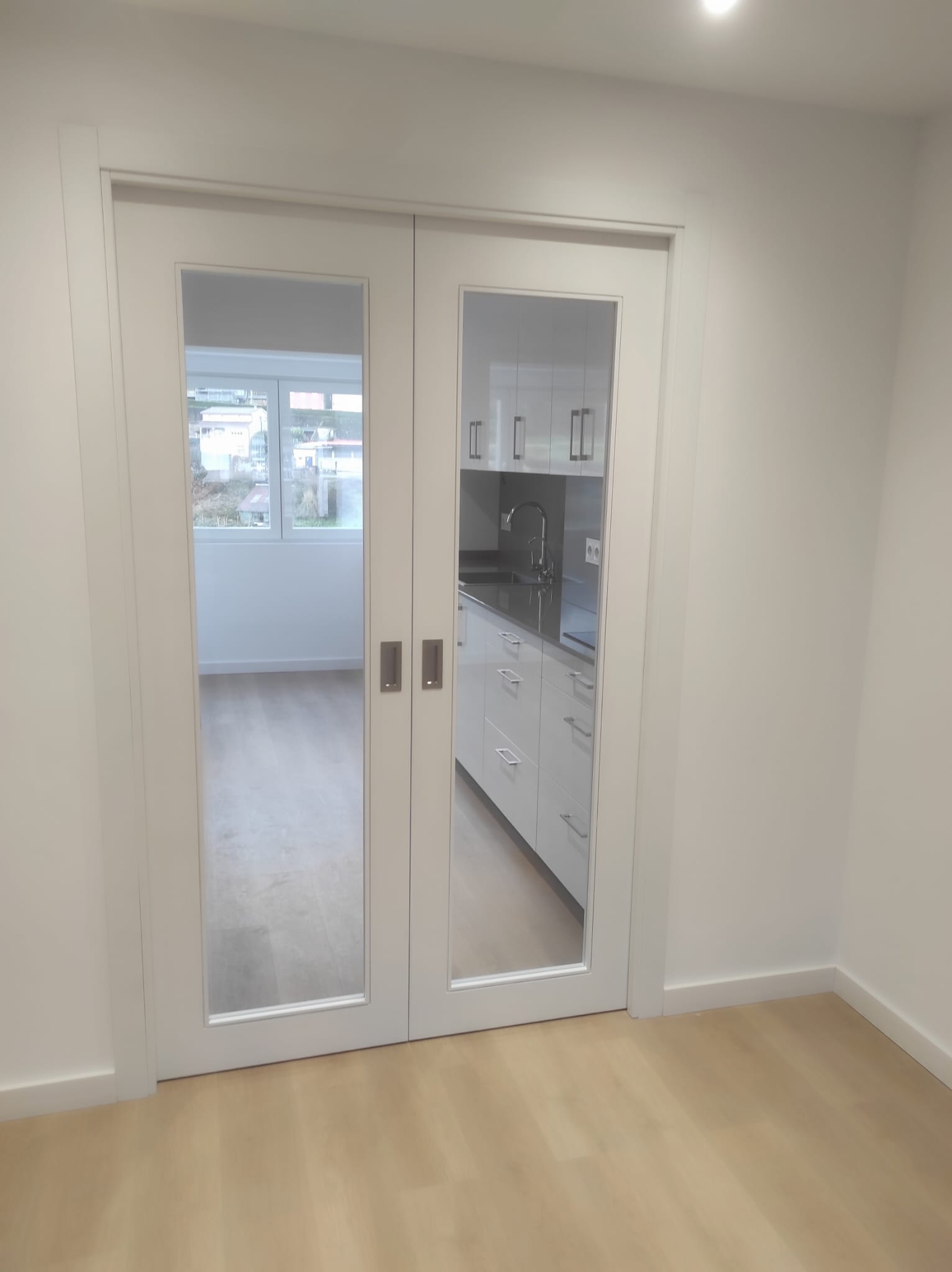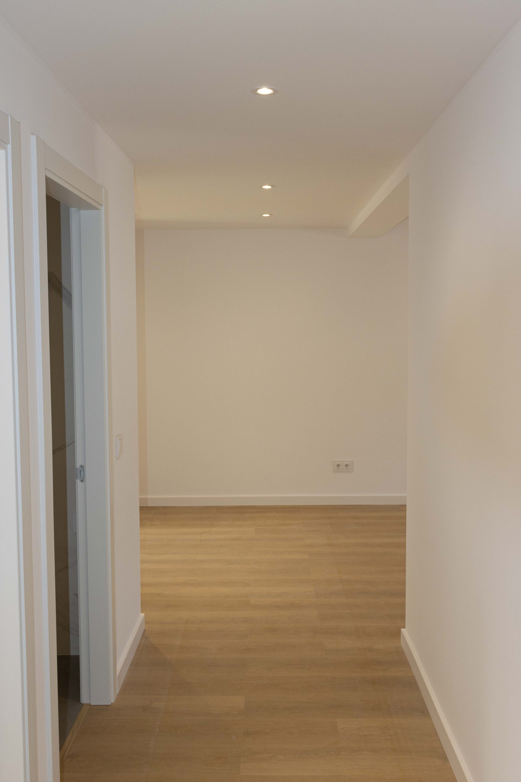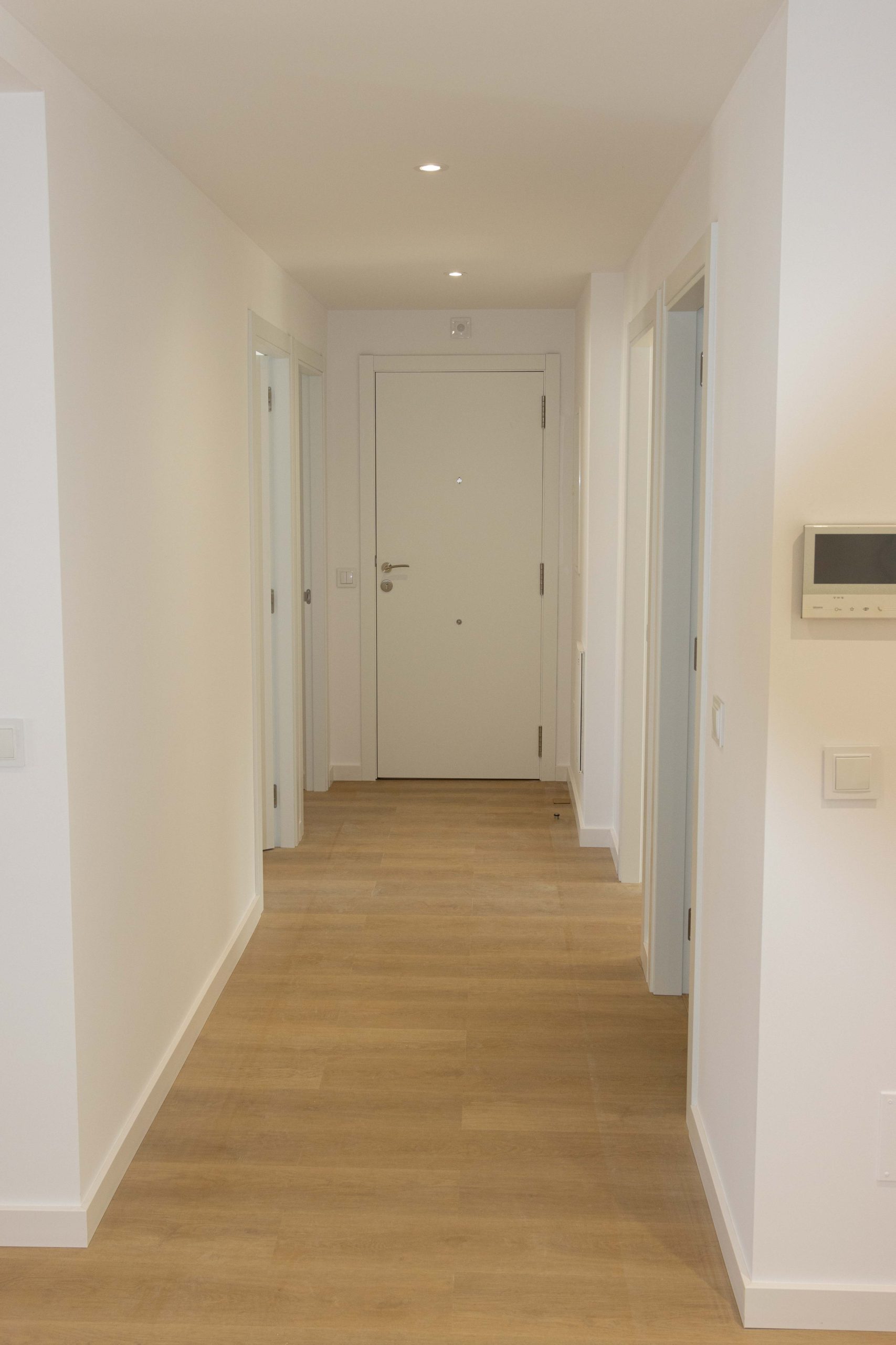 O proxecto incluíu a renovación completa dos acabados interiores, con novo pavimento continuo en ton madeira, paredes en branco para potenciar a luz e unha posta a punto xeral da vivenda. A intervención completouse con carpintarías interiores renovadas, achegando uniformidade e unha imaxe máis actual en corredores e estancias.