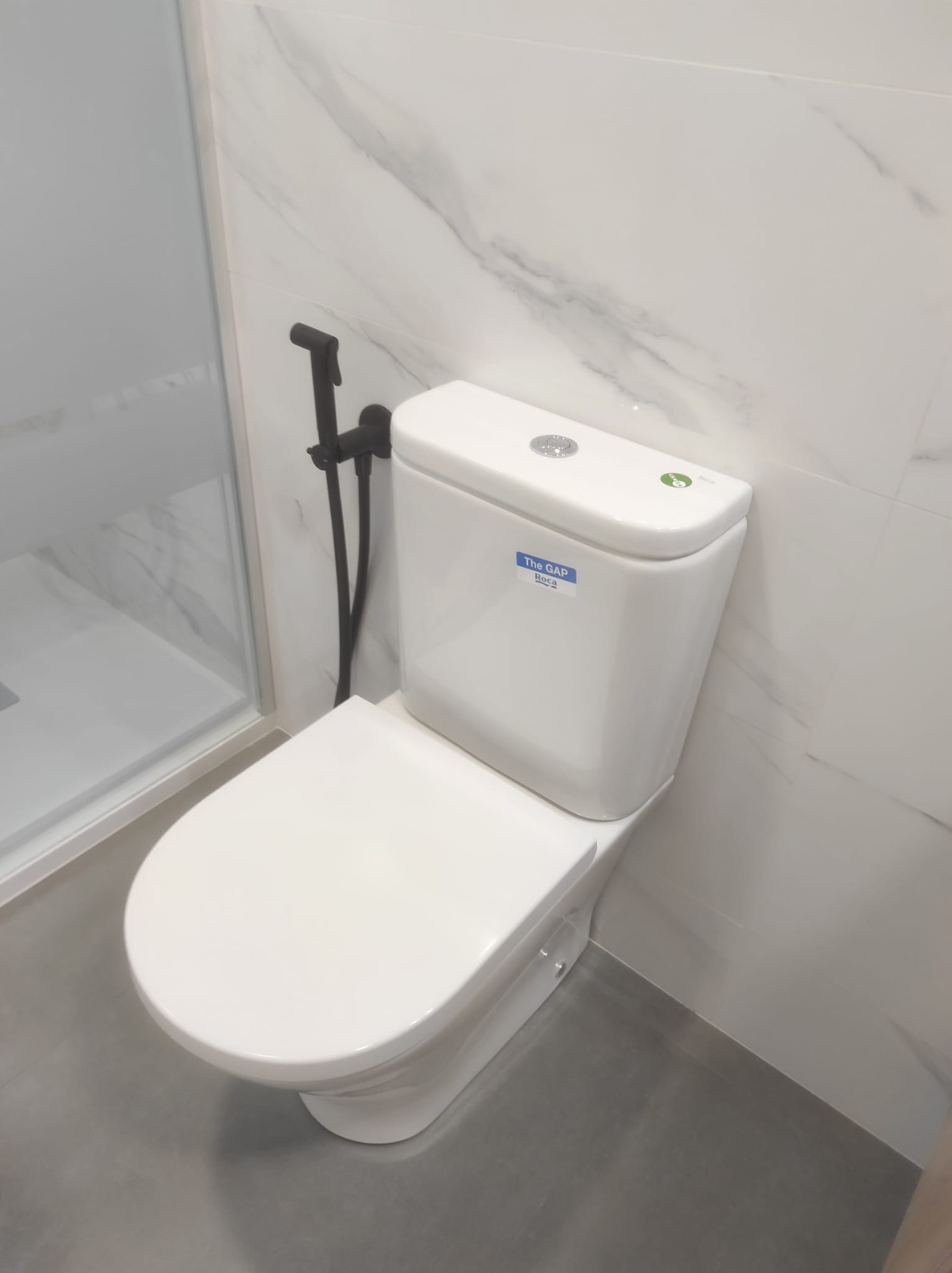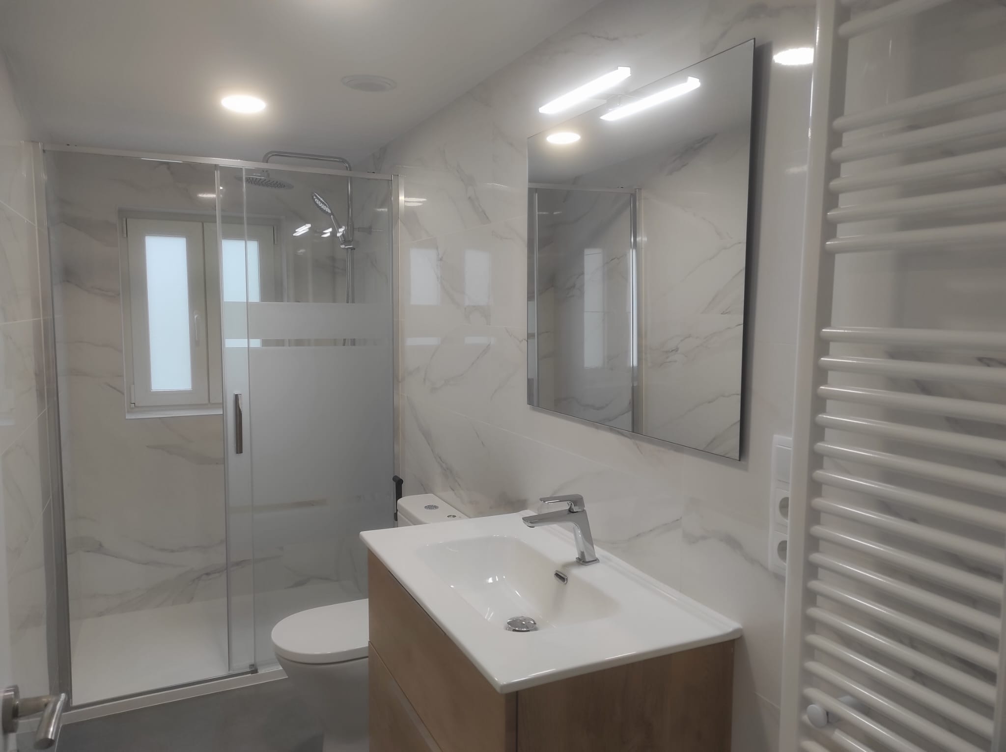 O baño transformouse cunha proposta de estilo elegante e actual: revestimentos de gran formato efecto mármore, mampara de vidro e un conxunto de lavabo de deseño minimalista, logrando un espazo máis cómodo, resistente e doado de manter, sen renunciar a un acabado premium.